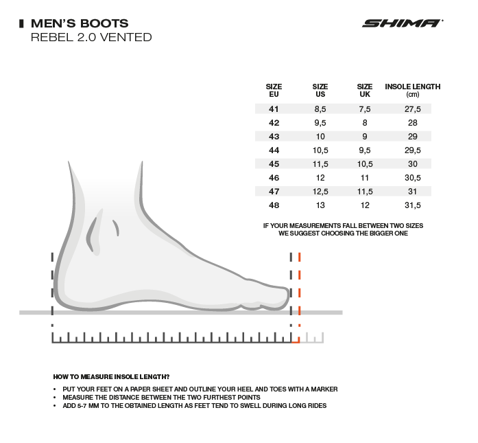 The SHIMA REBEL 2.0 VENTED sneakers offer you not only a stylish look, but above all the safety you need for everyday riding. The use of impact absorbers at the ankle and robust reinforcements at the heel, ankle and toe ensure stability and protection on the road. The transversely reinforced rubber sole and the polypropylene reinforcement insole inside the shoe guarantee confident and precise movement in any situation.