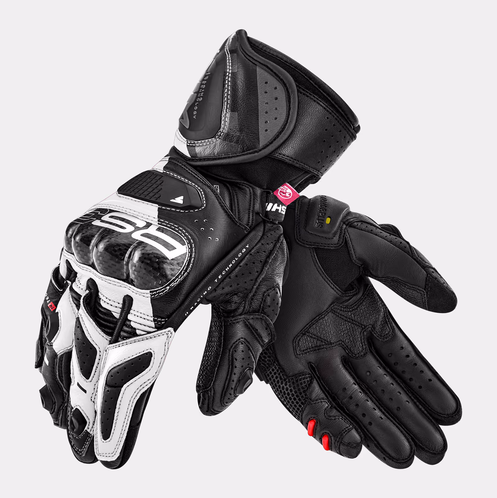 The SHIMA RS-3 Lady motorcycle gloves combine protection, comfort, and advanced technology, specifically designed for female motorcyclists who prioritize safety and comfort. Tailored to fit a woman's hand perfectly, they are crafted from durable goatskin leather and exceptionally supple yet tough kangaroo leather. These gloves deliver a high level of protection through advanced features such as a SAP palm slider, a hard knuckle protector with carbon reinforcement, a mini slider below the little finger, and a bonded outer finger to prevent roll-up in the event of an accident. Perforated leather and additional ventilation ensure excellent airflow, providing thermal comfort in all riding conditions. The long cuff and advanced V-Lock Pro™ fastening guarantee a secure fit, while elasticated panels, stretch inserts, and accordion pleats enhance mobility and overall comfort. The gloves are available in sizes XS to XL and in three stylish colours: BLACK, PINK, WHITE. The SHIMA RS-3 Lady glove is the third generation of RS gloves, offering unparalleled protection, comfort and feminine style!