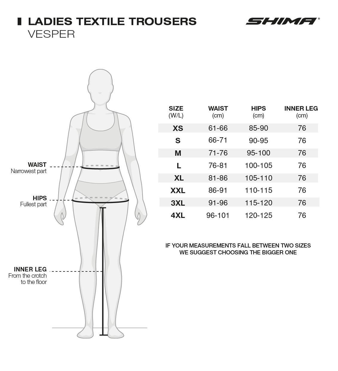 To determine the exact size, measure close to the body. The measuring tape should not be constricting. When measuring, it is best to wear light, tight-fitting clothing and stand in a relaxed but upright position. For more precise measurements, ask another person to help you. If the measured values are between different sizes, always choose the larger size.